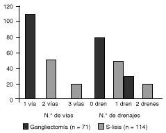 FIG. 2.--Distribución del número de vías de abordaje utilizados y del número de drenes empleados en ambos procedimientos. S-lisis: simpaticólisis. Gangliectomía: exéresis de ganglio simpático.