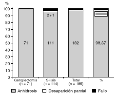 En el caso que nos ocupa, la finalidad de la intervención es provocar una anhidrosis de las extremidades superiores, lo que en nuestra serie se consiguió en el 100% cuando se realizó gangliectomía y en el 98,37% cuando se practicó simpaticólisis; resultados similares a los de otros autores (25, 26). El porcentaje de fallos registrados fue de 1/185, es decir, 0,54%, similar al de otros grupos (27-30).