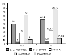 FIG. 7.--Resultados sobre sudoración compensatoria (SC) obtenida y grado de satisfacción de la población intervenida, expresados en valor absoluto (total) y porcentual (%).