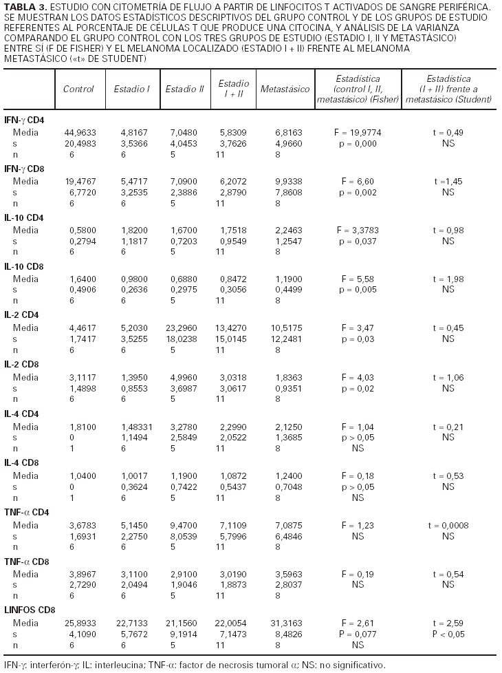 Para verificar o rechazar estas hipótesis estudiamos mediante citometría de flujo el patrón de citocinas producido por los linfocitos T circulantes en pacientes con melanoma en diferentes estadios.