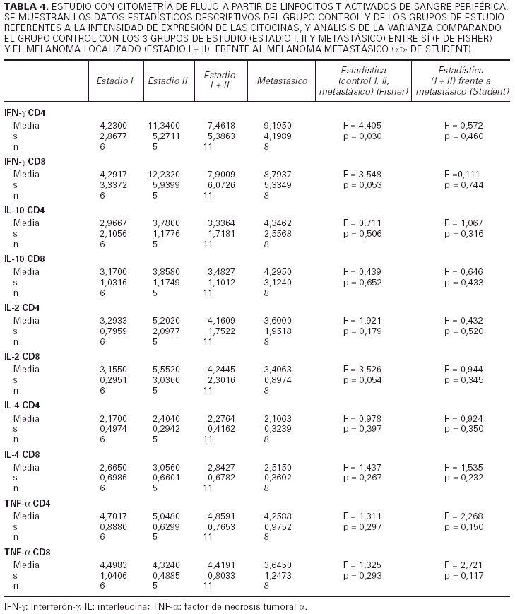 Al considerar la intesidad de expresión del IFN-γ por los linfocitos CD4 y CD8 observamos que existen diferencias estadísticamente significativas en el análisis de la variaza con la F de Fisher entre los tres grupos de estudio (estadio I, II y IV) en lo referente a los linfocitos CD4, mientras que en los linfocitos CD8 las diferencias se encuentran muy cerca de la significación. No existe, sin embargo, ninguna diferencia al considerar a los estadios localizados del melanoma (I + II) y al metastásico diseminado, y tampoco los localizados con un intervalo de superviviencia superior a los 2 años frente a los metastásicos.