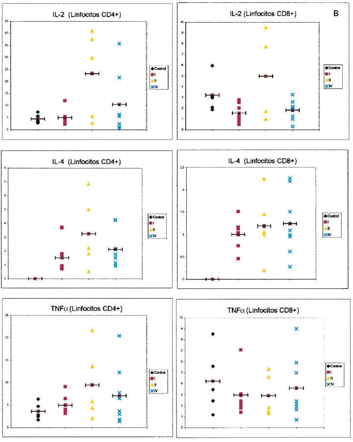 En la figura 1 puede observarse un ejemplo de la estrategia citométrica seguida para determinar la producción de citocinas por los linfocitos T. Se muestran los histogramas utilizados para seleccionar la población de linfocitos, por sus características morfológicas, y las subpoblaciones de linfocitos CD4 y CD8, por marcaje con anticuerpos CD3 y CD8. Por último se muestran los histogramas utilizados para la cuantificación de niveles intracelulares de citocinas. La figura 2 recoge los porcentajes de expresión de citocinas agrupando a los pacientes según su estadio clínico.