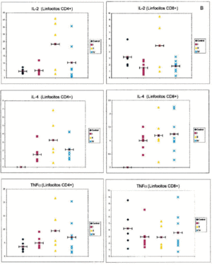 Analizaremos los resultados del estudio de cito-metría de flujo en sangre periférica, atendiendo en primer lugar al porcentaje de células productoras de cada citocina. Desglosaremos los datos, analizando cada citocina y para cada una de ellas comentaremos los resultados obtenidos al comparar: