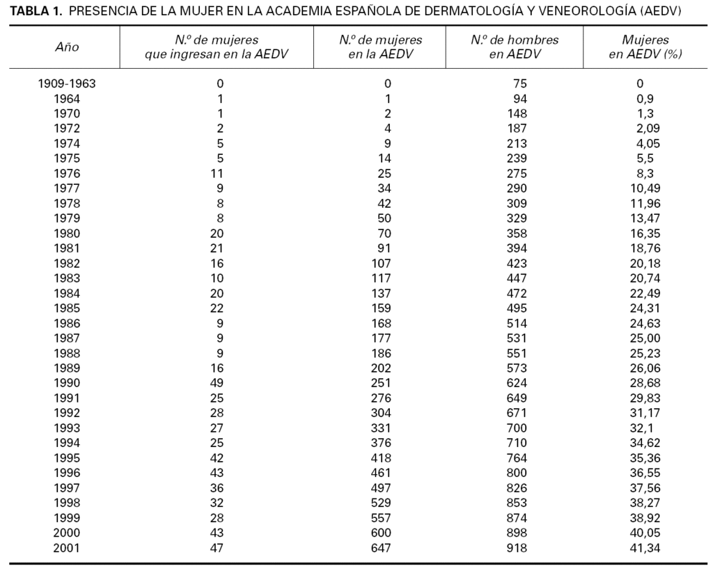 La Academia Española de Dermatología y Venereología (AEDV) es una sociedad médica que agrupa a la mayoría de los dermatólogos españoles. Fue fundada en el año 1909 por Juan de Azúa, y ha mantenido su presencia y actividad sin interrupción hasta el momento actual. Es la más antigua de las sociedades científicas españolas. Su trayectoria y el volumen de sus asociados permite realizar un paralelismo entre su existencia y comportamiento, y la existencia y comportamiento de los dermatólogos españoles, de forma que, salvo excepciones, lo que se pueda considerar válido para la AEDV lo será también para los dermatólogos españoles. Con esta premisa hemos realizado nuestra investigación sobre la mujer en la AEDV, entendiendo que los resultados obtenidos pueden ser extrapolados a la mujer dermatóloga en España en general.