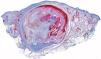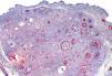 El panfoliculoma está constituido en su mayor parte por células foliculares germinativas y células matriciales, y además muestra diferenciación hacia la vaina radicular externa del folículo piloso al nivel del tallo y del istmo, gránulos de tricohialina, queratina azul-grisácea compacta similar a la que produce la vaina radicular interna queratinizada, islotes amarillo-anaranjados refráctiles de células sombra y pequeños quistes como expresión de diferenciación infundibular tapizados por células espinosas, una capa granulosa bien desarrollada y con gránulos de queratohialina y conteniendo queratina hojaldrada basófila y ortoqueratósica. En nuestro estudio observamos positividad focal para calretinina en la hilera de células que delimita la luz de los quistes con diferenciación tricolemial.
