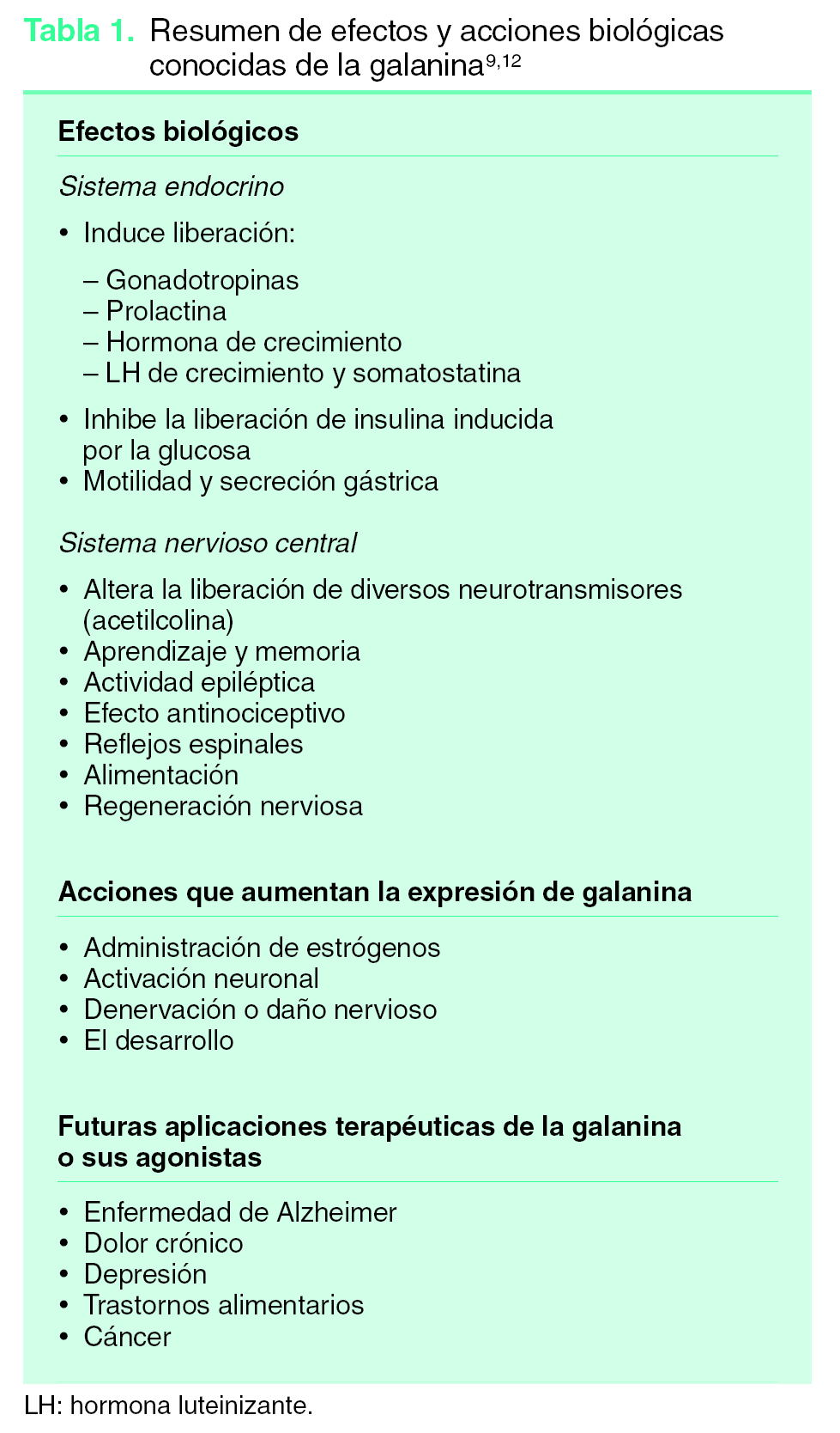 La galanina es un neuropéptido de 29 a 30 aminoácidos (en humanos) ampliamente distribuido en el sistema nervioso central y periférico, así como en el sistema endocrino. Sus efectos, tanto endógenos como exógenos, están mediados por 3 subtipos de receptores: GALR1, GALR2 y GALR3. Este ubicuo neuropéptido controla numerosas funciones (tabla 1), lo que junto con el hecho de que conserve su secuencia entre especies 8, sugiere que la galanina es un importante mensajero en la comunicación inter e intracelular 9. Existen pocos estudios acerca de la función de este neuropéptido en la piel. En animales de experimentación se ha probado que la galanina inhibe la respuesta inflamatoria cutánea mediante la modulación de la respuesta vascular 10. Por otro lado, se ha demostrado su presencia en algunas estructuras cutáneas, apoyando su papel en la fisiología de la piel 11.