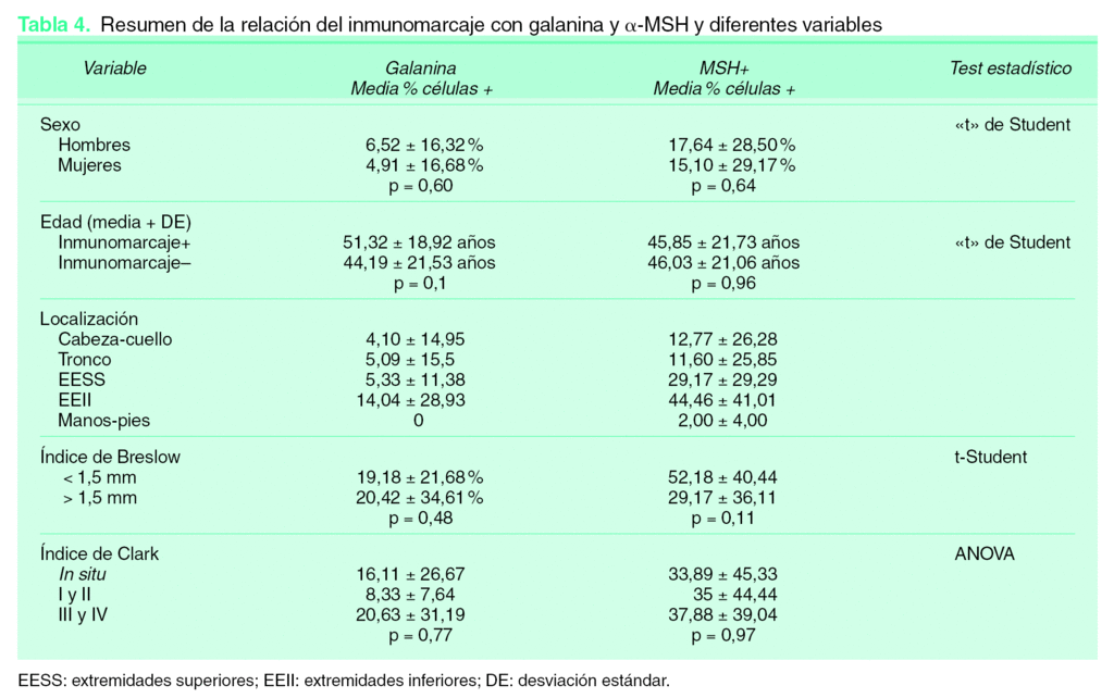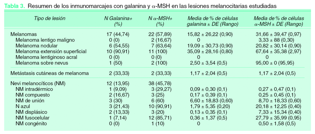 Nuestro trabajo encuentra una correlación significativa entre la expresión de galanina y α -MSH en melanomas, lo que hemos demostrado tanto en las imágenes histológicas como desde el punto de vista estadístico. Por otro lado, el porcentaje de nuestros melanomas, que fueron positivos para α -MSH, fue del 57 %, similar al obtenido por otros autores 3. Sin embargo, también hemos detectado un significativo inmunomarcaje con α -MSH en nevus azules y nevus fusocelulares, lo que no ha sido previamente descrito.