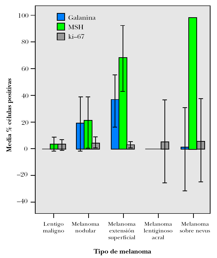 Figura 5. Gráfico de medias de porcentajes de células con inmunomarcajes positivos para galanina, α-MSH y ki-67 en melanomas. Las barras que representan los errores estándar en el melanoma lentiginoso acral y el melanoma sobre nevus son muy amplias, ya que en cada uno de estos grupos se incluyen tan sólo dos casos. Barras de error: IC 95 %.