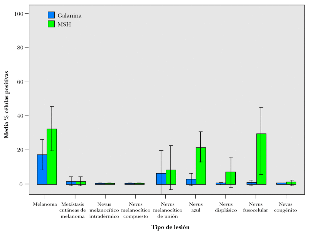Figura 6. Gráfico de medias de porcentajes de células con inmunomarcajes positivos para galanina y α -MSH en lesiones melanocitarias. Barras de error: IC 95 %.