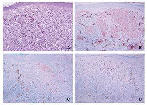 Figura 2.(A) Imagenhistológica de un melanomasobre nevus; (B) el 95% de las células de melanomamostraron expresión de α-MSH (en rojo) mientras quelas células névicas (en azul)no lo expresaron; (C) escasascélulas mostraron positividadpara galanina (rojo) y (D) positividad paraki-67también en elcomponente de melanoma y no en el névico.