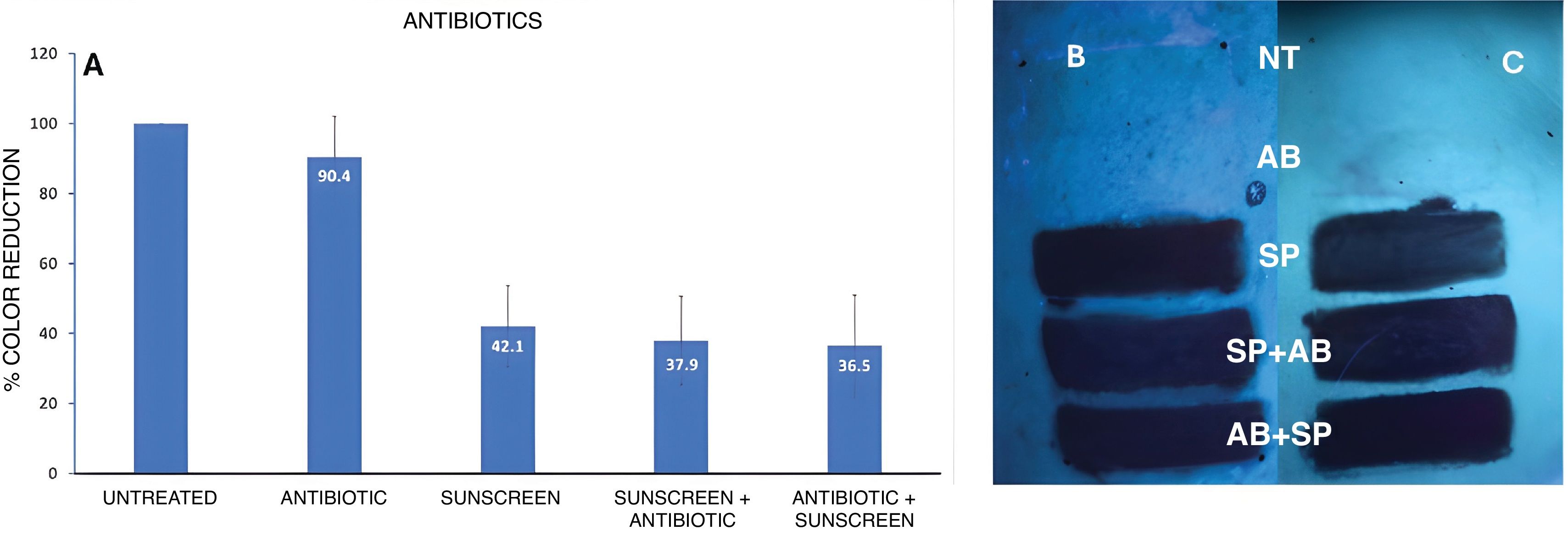 AntifungalsIn the antifungal group, bifonazole absorbance (Fig. 3D) showed a significant color reduction to 85% (95% CI, 89.2–89.8%) vs untreated skin (example image in Fig. 3C). In contrast, ketoconazole (example in Fig. 3B) and clotrimazole did not show significant changes. When antifungals were grouped, application before sunscreen reduced color level to 39.3% (95% CI, 33.7–44.8%) relative to untreated skin, while sunscreen alone produced a reduction to 49.38% (95% CI, 39.8–53.6%) (Fig. 4A). When the antifungal was applied after sunscreen, the reduction in color percentage was not significantly different from sunscreen alone (p>0.05).