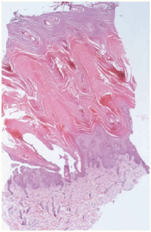 Se realizó una biopsia cutánea de la pierna izquierda, donde se apreciaba una hiperqueratosis compacta lamelar con focos aislados de paraqueratosis y persistencia de la capa granulosa (fig. 4). De acuerdo con los padres, se desestimó el tratamiento con etretinato. Se mantuvo a la paciente con nutrición enteral, sueroterapia, pomadas oculares epitelizantes, analgésicos, emolientes y fomentos con sulfato de cinc (1:1.000). Al final de la primera semana, las grandes escamas empezaron a desprenderse, y apareció debajo un fondo eritematoso. Posteriomente se observaron lesiones cianóticas en las puntas de los dedos de los pies. A los 18 días se produjo el fallecimiento precedido de un empeoramiento de su estado general con intensos episodios de vómitos y pausas de apnea. No se realizó autopsia.