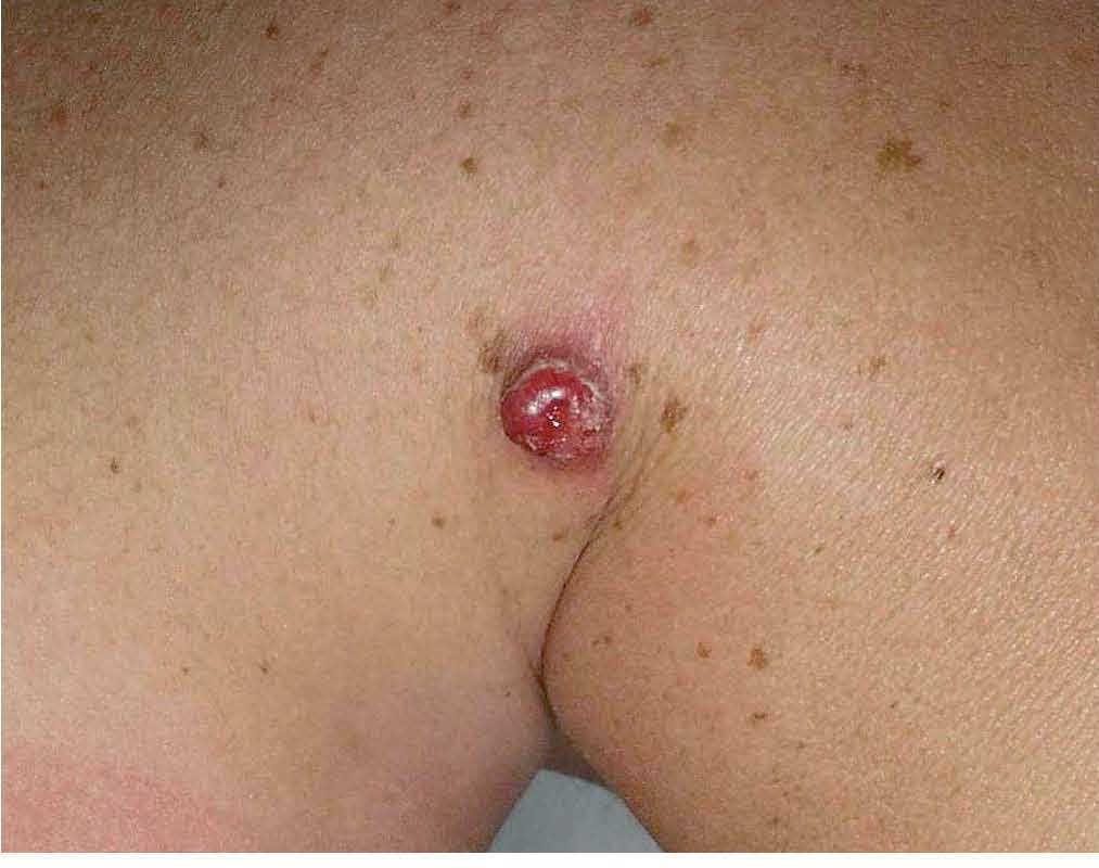 El tiempo hasta el diagnóstico es escaso, con una media de 4 meses, lo que coincide con otras series8 . Habitualmente se trata de lesiones únicas, y sólo hay dos publicaciones de localizaciones múltiples9,10 . La morfología de las lesiones es muy variada, pudiendo recordar a diversos tumores, que aparecen en la misma localización con mayor frecuencia, como carcinomas basocelulares o epidermoides. Incluso se ha descrito una variante pigmentada, en la que la pigmentación se debe a la ingesta y posterior degradación de eritrocitos por parte de las células neoplásicas, lo que conduce a la acumulación de hemosiderina en su citoplasma. Esta variante puede ser confundida tanto clínica como histológicamente con el melanoma11 . Por ello es muy complicado realizar el diagnóstico antes del estudio histológico.