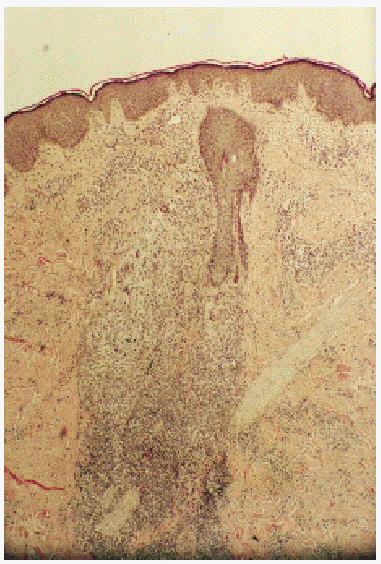 Fig. 2.--Infiltrado granulomatoso perifolicular con linfocitos, polimorfonucleares y células gigantes a cuerpo extraño (hematoxilina-eosina, 40x).