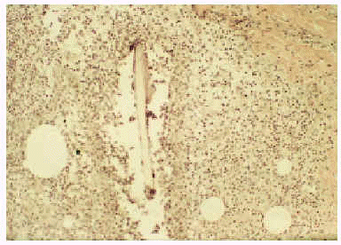 Fig. 3.--Infiltrado granulomatoso alrededor de un folículo (hematoxilina-eosina, 100x).