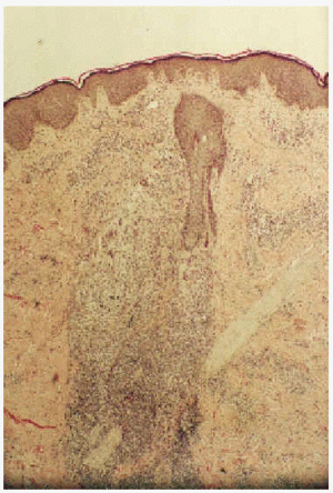 El estudio histopatológico de una de las lesiones mostró la presencia de una epidermis normal y un infiltrado granulomatoso de predominio perifolicular (fig. 2), constituido por linfocitos y polimorfonucleares con multitud de células gigantes de cuerpo extraño. Muchos de los folículos pilosos se encontraban destruidos (fig. 3). La tinción con PAS no evidenció la presencia de hongos. Mediante término de reacción en cadena de la polimerasa (PCR) se detectó ADN del virus varicela zóster (VVZ). Las lesiones involucionaron espontáneamente en aproximadamente 20 días, sin desarrollarse lesiones residuales.
