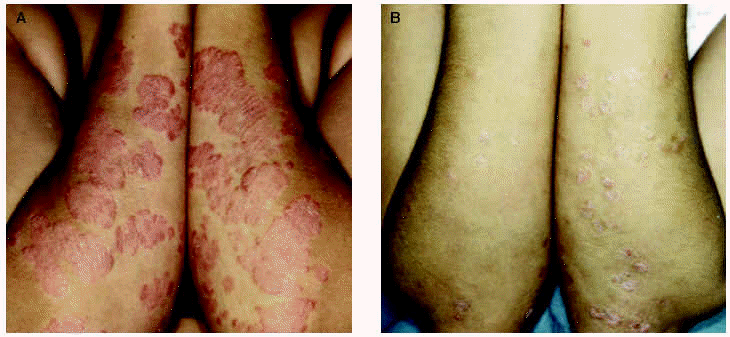 Fig. 1.--Imágenes clínicas de un paciente antes (A) y después (B) de un ciclo de terapia ultravioleta B (UVB) de banda estrecha.