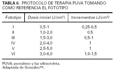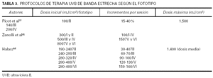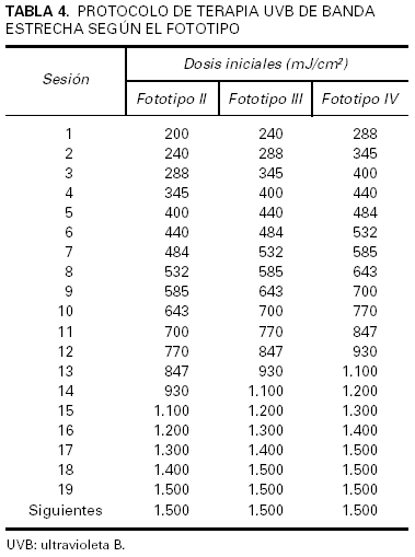 Una alternativa a la determinación de la DEM sería la elección de la dosis inicial en función del fototipo. Esta estrategia presenta la ventaja de que el tratamiento puede iniciarse de forma inmediata, lo que permite resultados igualmente satisfactorios aun cuando es conocida una muy considerable variabilidad idiosincrásica de la DEM que no siempre tiene una correspondencia adecuada con el fototipo21. En la tabla 3 se exponen ejemplos de protocolos basados en el fototipo64,65. En la tabla 4 se adjunta la pauta empleada en nuestro centro.
