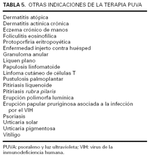 Otras indicaciones. Se ha descrito el empleo de la terapia PUVA en enfermedades de naturaleza muy diversa, casi siempre tras el fracaso de propuestas terapéuticas más convencionales, entre las que se citan el síndrome de Schnitzler95, la EICH96,97, la necrobiosis lipoídica98, el liquen mixedematoso99, la queratosis liquenoide crónica100 o el prurito acuagénico101. Otras indicaciones de la terapia PUVA aparecen listadas en la tabla 5.