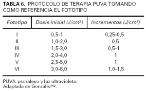 Vitíligo. El vitíligo ha sido una de las indicaciones clásicas de la terapia PUVA, incluso antes de estar disponibles las fuentes de radiación artificial. Las dosis de psoraleno son algo menores que en el caso de la psoriasis, de 0,3 a 0,6 mg/kg para 8-MOP y de 0,6 a 1,2 mg/kg para 5-MOP85. La pauta se inicia a dosis de 1 o 2 J/cm2, con incrementos de 0,25 J/cm2 para los fototipos I y II o de 0,5-1 J/cm2 para los fototipos III a V, con una frecuencia de dos a tres sesiones por semana. Se recomienda realizar un periodo de prueba de unos 3 meses, tras el cual sólo se continuará si existe evidencia de repigmentación, hasta alrededor de 1 año. Aunque el 70-80 % de los pacientes experimentará algún grado de repigmentación, ésta será completa en no más del 20 %86, observándose una recaída de magnitud variable en hasta el 75 % de los casos en un intervalo de 1 o 2 años87. En general, las mejores respuestas se obtendrán en individuos de fototipos pigmentados, en niños y en determinadas localizaciones como la cara, el tronco y la región proximal de las extremidades. En un estudio retrospectivo reciente, realizado sobre la experiencia clínica de 10 años, Kwok et al88 comprobaron una repigmentación completa o casi completa en sólo 8 de 97 pacientes, por lo que recomendaron prudencia a la hora de escoger los pacientes y de informar acerca de las expectativas de respuesta.