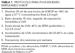 El empleo de PUVA tópica resulta preferible al oral en los pacientes con un escaso número de lesiones, con trastornos hepáticos o gastrointestinales, en individuos con cataratas o cuando se presuponga interacción entre los psoralenos y otros fármacos, como por ejemplo warfarinas. También podría considerarse esta opción con el objetivo de reducir el tiempo de irradiación en pacientes de fototipos altos que precisarían de dosis de UVA muy elevadas. Aunque existe una amplia variabilidad con respecto a la concentración adecuada, se adjuntan las propuestas de consenso realizadas al respecto por la academia británica48.