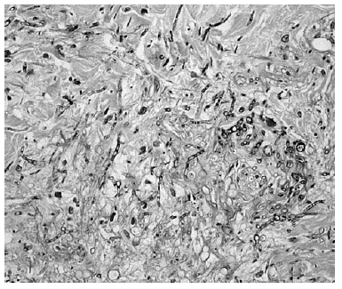 Fig. 2.--Intensa infiltración por elementos fúngicos en dermis media y profunda (H&E).