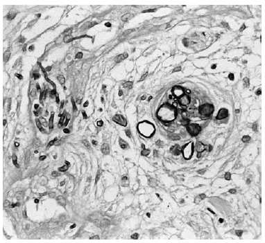 La biopsia de piel mostró discreta espongiosis y exocitosis linfocitaria en la epidermis, observándose en dermis papilar y reticular una intensa infiltración por elementos fúngicos en forma de hifas tabicadas y no tabicadas, en ocasiones bifurcadas, y por estructuras de tipo levaduriforme (fig. 2). Estas hifas tenían afinidad por las paredes vasculares a las que invadían (fig. 3). La respuesta inflamatoria acompañante es prácticamente nula. En el cultivo de la biopsia cutánea se identificó un hongo del género Fusarium, siendo los hemocultivos, cultivos del catéter y de esputo negativos.