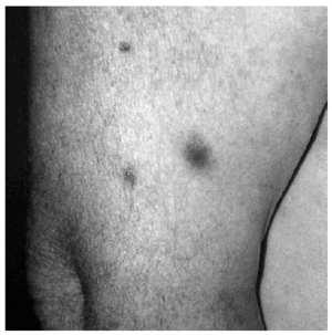 En el día +35 de quimioterapia se observaron múltiples lesiones de aproximadamente 10-12 días de evolución. Estas lesiones, papulonodulares, bien delimitadas, alguna de ellas con centro necrótico, salpicadas en tronco y miembros, eran asintomáticas y estaban infiltradas a la palpación (fig. 1). El cuadro se acompañaba de fiebre, mal estado general y debilidad muscular.