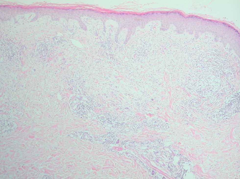 Fig. 3.--En los dos tercios superiores de la dermis se aprecia un infiltrado linfohistiocitario con células gigantes en empalizada rodeando zonas de colágeno degenerado (hematoxilina-eosina × 100).