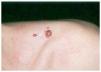 Fig. 1.--Lesiones satélite de hasta 7 mm de diámetro alrededor de la lesión extirpada 5 meses antes.