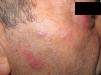 The patient was a 74-year-old Spanish man who had never traveled outside Spain. He had been diagnosed with refractory anemia with excess blasts type 1 a year previously and was referred with skin lesions accompanied by arthralgia and no signs of frank arthritis. The lesions were erythematous plaques measuring 2-3cm on his forehead, neck, and cheek. Sensitivity, body hair, and sweating remained unaffected (Fig. 4). Three months earlier he had presented with similar lesions 1 month after the first cycle of therapy with azacytidine; the lesions resolved completely with prednisone at 0.5mg/kg/d. The skin biopsy revealed a superficial, deep, periadnexal perivascular inflammatory infiltrate consisting of mature lymphocytes without atypia accompanied by interstitial histiocytic granulomas (no necrosis) (Fig. 5), scant eosinophils, and multinucleated giant cells. Vacuolar degeneration of the basement membrane and necrotic keratinocytes were observed in specific areas. Standard microscopy and polarized light microscopy revealed no foreign bodies or intracytoplasmic bodies. The results of culture and serology testing for syphilis and human immunodeficiency virus were negative. Immunohistochemistry (CD15 staining) revealed few cells. The results of direct immunofluorescence (IgG, IgM, IgA, C3, and fibrinogen) and Ziehl-Neelsen staining were also negative. The blood workup was remarkable—other than for the patient's myelodysplasia—for levels of C-reactive protein (16.7mg/dL) and the erythrocyte sedimentation rate (88mm). All other parameters—antinuclear antibodies, anti–native DNA antibodies, anti–extractable nuclear antigen antibodies, and complement (C3, and C4)—were normal. As in the previous case, no molecular studies to rule out leishmaniasis were performed. The lesions resolved without treatment after 1 month and did not reappear with subsequent cycles of azacytidine. Three years later, the myelodysplasia has progressed to acute myeloid leukemia.