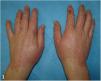 Physical examination revealed erythematous, scaly plaques with marked lichenification on the dorsa of the hands and lateral aspects of the fingers. Superficial fissures were also observed on the fingers (Fig. 1).
