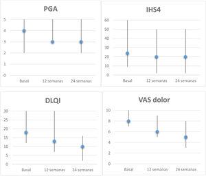 Evolución de las escalas de los pacientes con HS tratados con apremilast. Mediana y rango (basal, semana 12 y 24) de PGA, IHS4, DLQI y VAS dolor (0-10). Análisis de la reducción a los 6 meses mediante la prueba Wilcoxon para muestras apareadas: PGA, p=0,157; IHS4, p=0,068; DLQI, p=0,043 y VAS dolor, p=0,042. DLQI: Dermatology Life Quality Index; IHS4: International HS Severity Score System; PGA: Physician's Global Assessment; VAS: Visual Analogical Scale.