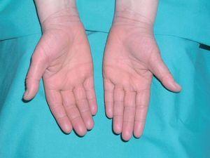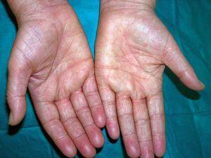 Presentaba hiperqueratoris palmoplantar simétrica con fisuras de fondo hemorrágico (figs. 1y 2). Dichas lesiones tenían un año de evolución y eran intensamente pruriginosas.