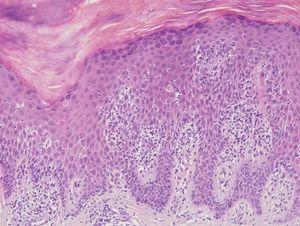 Se realizó una biopsia cutánea de la planta del pie, donde se observaba marcada hiperplasia epidérmica con importante hiperqueratosis hipergranulosis. Existe, además, un moderado infiltrado inflamatorio dérmico con focos de exocitosis acompañado de ligera espongiosis y abundantes queratinocitos necróticos (fig. 3).