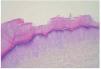 Fig. 2.--Depresión de la epidermis en «escalera» entre la piel normal y afectada. Adelgazamiento de las capas córnea y granulosa sobre el área deprimida, en contraste con la piel normal circundante (HE, ×100).