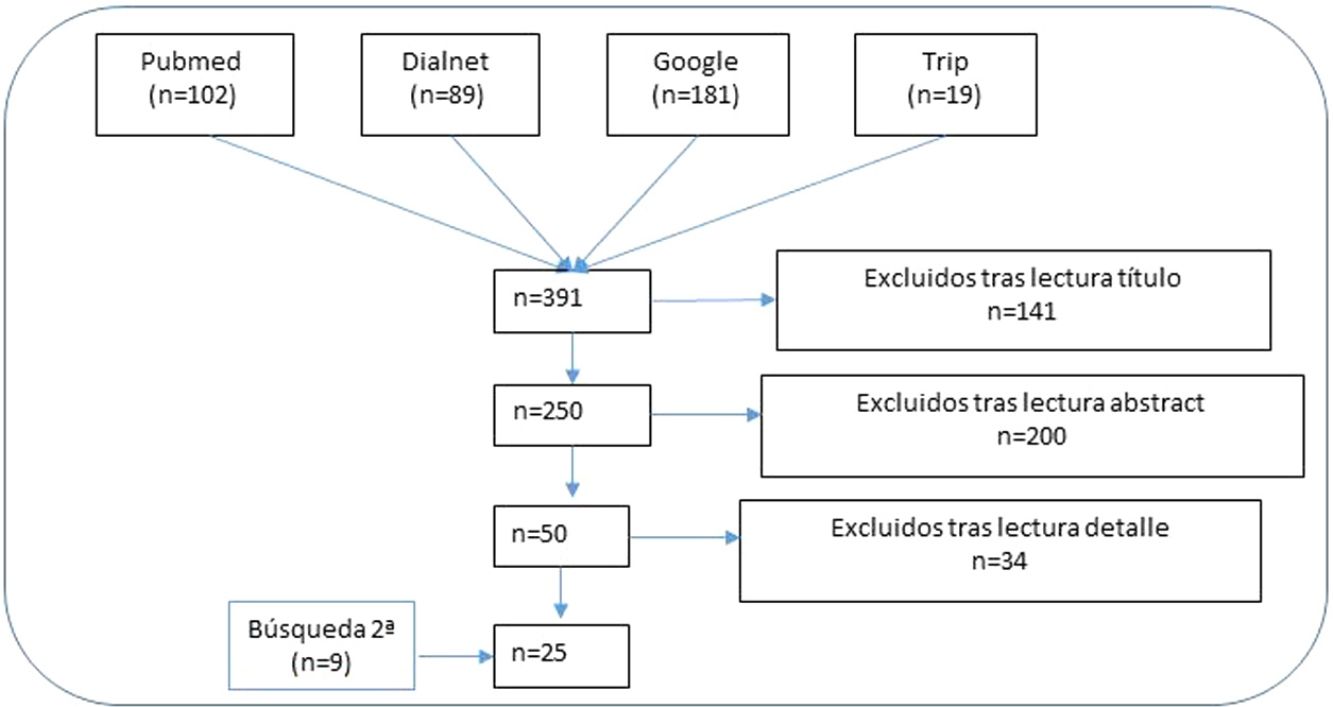 ResultadosRevisión narrativa de la literaturaSe recuperaron 391 artículos con las estrategias de búsqueda en las bases de datos bibliográficas, de los que se eliminaron 141 tras el primer cribado (figura 1). Con la lectura de los resúmenes se eliminaron 200 más. Finalmente, una vez leídos en detalle los artículos resultantes de los 2 procesos de selección anteriores se excluyeron 34 artículos y se incluyeron 25 (9 provenientes de la búsqueda secundaria)11,15,22–44.