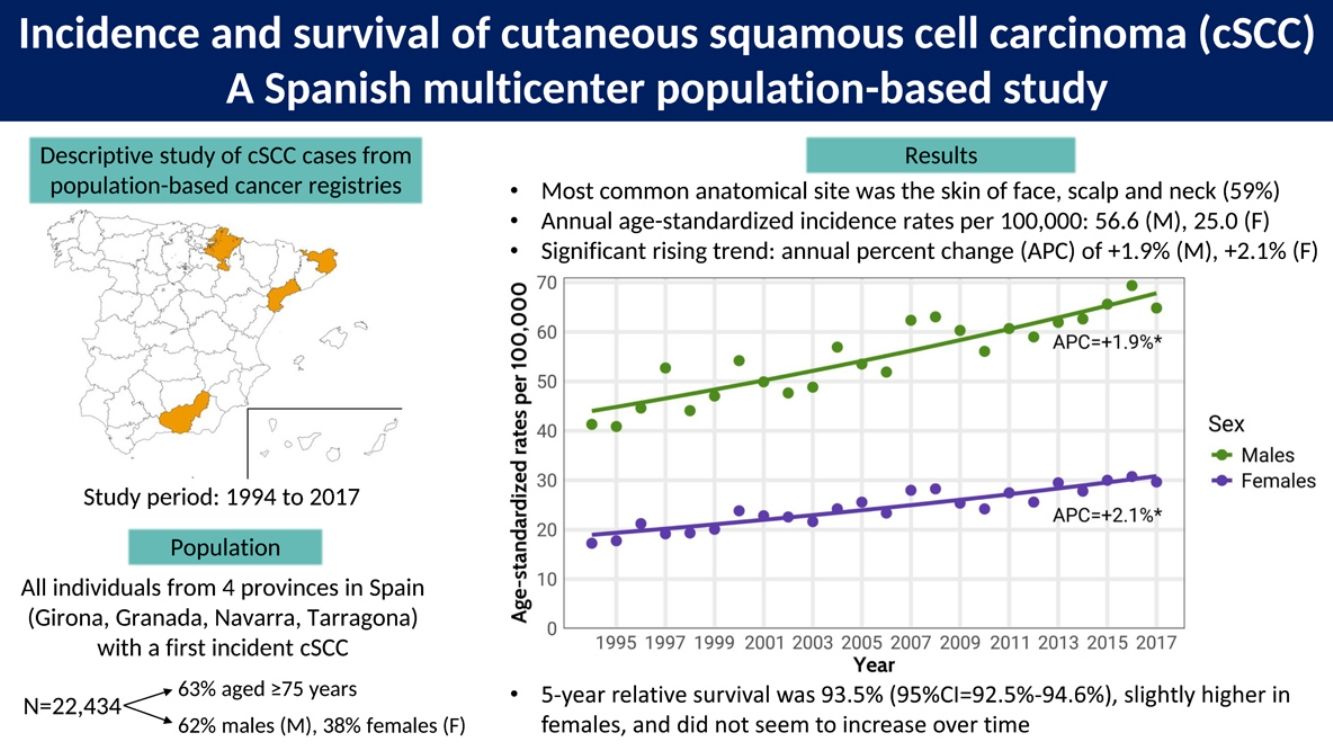 ConclusionsThis population-based study from 4 cancer registries provides an updated description of cSCC incidence rate and survival, which are key epidemiological indicators to frame the scenario of this cancer in Spain. Overall, our results are fairly consistent with previous studies, showing a rising trend in cSCC incidence alongside high survival rates. Further research is warranted to elucidate the causes underlying these findings.