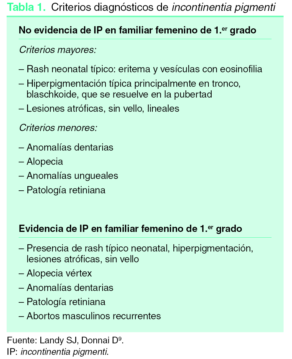 Con el fin de identificar tanto los casos típicos como los más sutiles Landy y Donnai en 1993 propusieron unos criterios diagnósticos, que pueden servir al clínico a modo de guía9 (tabla 1). En ellos se da mucho peso a los antecedentes familiares, de forma que cuando éstos están presentes los criterios menores pasan a ser mayores, y apoyan el diagnóstico de IP de igual manera que los clásicos criterios cutáneos. Por el contrario si no existen antecedentes familiares reconocibles, al menos un criterio mayor cutáneo es necesario para establecer el diagnóstico y unos criterios menores para apoyarlo. Los cambios histológicos de los diferentes estadios son característicos aunque no patognomónicos15 y desempeñan un papel importante en el diagnóstico, apoyando los hallazgos clínicos. Recurriremos al estudio genético, en líneas generales, para proporcionar consejo genético y para confirmar aquellos casos dudosos así como los que se presentan en varones.
