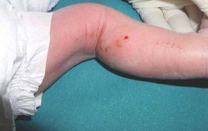 Una niña de 3 días de vida, nacida de embarazo y parto normales, sin antecedentes familiares de interés, es referida a nuestra consulta al tercer día de vida para valoración de lesiones vesiculosas interpretadas como herpéticas, tratadas sin éxito con aciclovir intravenoso. En la exploración física se objetivaron lesiones vesiculosas, erosivas, que alternaban con otras de aspecto costroso, siguiendo un trayecto lineal longitudinal en miembros inferiores (fig. 1), y trayectos lineales transversales y en «V» en tronco posterior. Más tarde las lesiones fueron evolucionando, y a las tres semanas de vida coexistían lesiones hiperqueratósicas junto con otras vesiculoerosivas en miembros inferiores, al mismo tiempo que aparecieron otras de aspecto verrucoso en porción acral de miembros superiores. Además, esta paciente desarrolló en un corto periodo de tiempo estrabismo y patología retiniana que desembocó finalmente en un desprendimiento de retina. El estudio anatomopatológico evidenció espongiosis eosinofílica y vesículas rellenas de eosinófilos, todo ello consistente con el diagnóstico de IP.