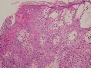 Figura 4. Dermatitis espongiótica eosinofílica, vesículas intraepidérmicas rellenas de eosinófilos y células disqueratósicas multiples; todos ellos son hallazgos histológicos típicos del estadio 1. (Hematoxilina-eosina, x20.)