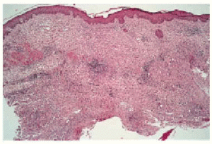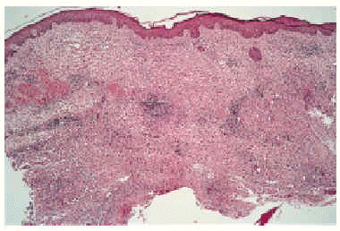Fig. 4.--Reacción inflamatoria granulomatosa confluente, con fenómenos de abscesificación en dermis profunda (hematoxilina-eosina, 40x.)
