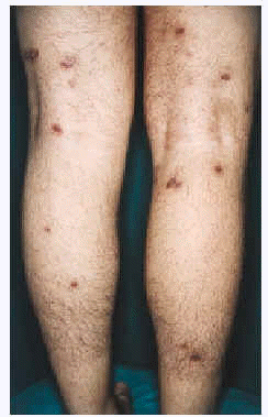 Fig. 2.--Varias lesiones nodulares en cara posterior de extremidades inferiores.