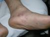 Patient 2 was a 37-year-old man with human immunodeficiency virus (HIV) infection, type 2 diabetes mellitus, and Burkitt lymphoma in complete remission (nonrecent chemotherapy). He had multiple crops of papules on the legs and soles of the feet (Fig. 1), histopathological findings consistent with NEH, and a positive lesion culture for Mycobacterium chelonae. The recurrent skin lesions disappeared after 12 months of treatment with clarithromycin, ciprofloxacin, and cotrimoxazole. There have been no known recurrences.