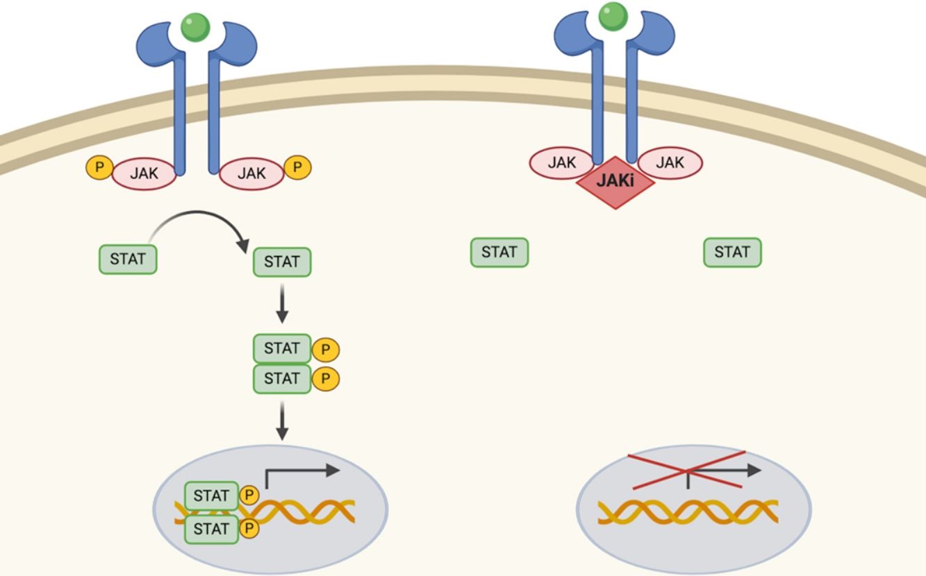 Vía JAK/STAT y mecanismo de acción de los inhibidores JAK.