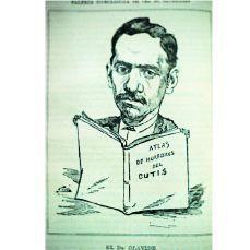 FIG. 7.--Caricatura de Olavide por uno de los más afamados caricaturistas de siglo XIX en España, Ramón Cilla. Representa al autor junto a su «Dermatología General y Clínica Iconográfica de las Enfermedades de la Piel o Dermatosis». Se publicó en la revista mEdica humorística «El Doctor Sangredo». El tamaño proporcional del libro no sólo es una distorsión propia de la caricatura, sino que trata de representar el gran porte del mismo (láminas de doble folio). El título del libro es la expresión del impacto que producían las láminas en los profanos.