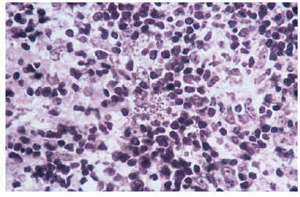 Fig. 2.--Escasos histiocitos con leishmanias intracelulares rodeados de abundantes linfocitos.