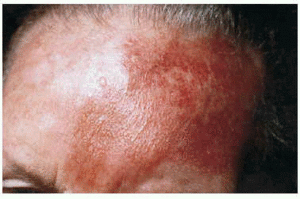 FIG. 1.--Placa eritematosa, infiltrada y exudativa de bordes bien delimitados en hemifrente izquierda.
