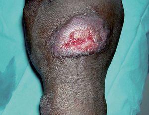 Se trata de un varón de 38 años, procedente de Senegal, que llevaba en España tan sólo 20 días, sin antecedentes médicos de interés, y que acudió a la consulta por la aparición de unas lesiones cutáneas asintomáticas en la muñeca derecha, de mes y medio de evolución (el cuadro comenzó en Senegal), que poco a poco habían ido creciendo y se habían ulcerado. Había realizado diversos tratamientos con antibióticos tópicos y sistémicos sin obtener ninguna respuesta.