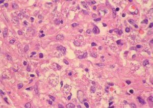 El resultado de la biopsia mostró un denso infiltrado inflamatorio en dermis superficial y profunda, acompañado de numerosos cuerpos ovalados de unas 6 micras, tanto dentro como fuera de los macrófagos, que se corresponden con los amastigotes (forma intracelular que adopta la Leishmania en el huésped, a diferencia de la forma promastigote que adopta en el mosquito vector) (figs. 3 y 4).